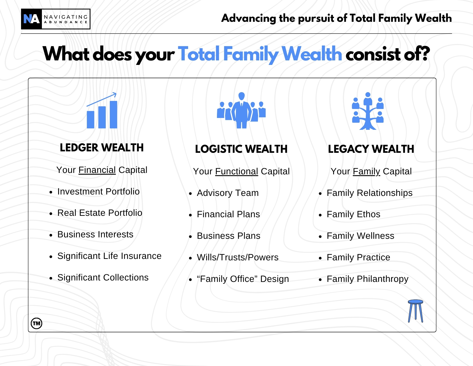 Treating symptoms in one area at the neglect of others creates an imbalance of Total Family Wealth. Navigating Abundance prescribes a solution of three vital categories that make up your Total Family Wealth.